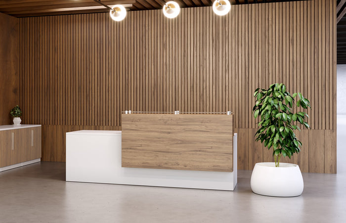 Make a memorable first impression with a well-designed and functional reception desk. Featuring a stack-on transaction counter, The Stax Reception Desk provides your guests plenty of space to exchange information on a clean and sleek surface. With quality and affordability in mind, this reception desk is a great option for a welcoming experience.